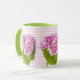 Décorez votre cuisine pour le printemps et l'été avec des tasses à café imprimées de fleurs. Cette tasse à café présente un fond rayé rose pastel et blanc avec une superposition de fleurs d'hortensia roses. Achetez pour vous-même ou offrez en cadeau à cette personne spéciale. La combinaison de couleurs avec de jolies fleurs fait de cette tasse un cadeau parfait pour la fête des mères ou une autre occasion.