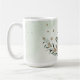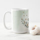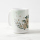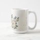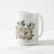 Tasse à café unique avec des fleurs de champagne romantiques et des feuilles vertes.