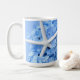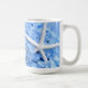 Tasse à café fleurie avec des fleurs d'hydrangée bleu clair et des étoiles de mer blanches. Le design est un effet miroir à montrer de part et d'autre de la tasse, ou choisir la tasse de voyage.