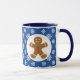 Cette tasse de Noël dépeint un bonhomme en pain d'épice entouré par un motif des flocons de neige sur un arrière - plan bleu. C'est une addition gentille à votre maison ou bureau.