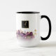 Élégant violet doré Floral noir Monogramme Mug. Des fleurs florissantes dans des détails rouge, violet et doré et des feuilles apparaissent d'un dégradé doux sur la partie amante tout autour de cette tasse. Un carré imprimé noir avec un cadre doré, votre lettre monogramme et votre nom complet personnalisable pour vous des deux côtés. Une tasse féminine et élégante, un joli ajout à votre espace bureau. Sirotez dans le style. Voir les produits assortis avec le même thème de conception dans la collection. Mélanger et apparier ou utiliser seul.