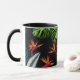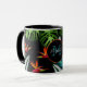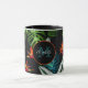 Un arrière - plan noir chic. Forêt tropicale verte et bleue, jungle. Palmier et feuilles de banane, feuillage aux fleurs rouges et oranges, fleurs. Un cadre noir et orange avec espace pour votre nom et lettre monogramme. Le nom est écrit avec un script de style moderne écrit à la main.