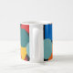 Cette tasse a une conception Bauhaus de formes aléatoires en bleu, turquoise, jaune, rouge et orange.