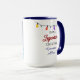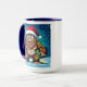 A funny Sasquatch personalized Christmas coffee mug with a comic book style pop art sasquatch smiling with a Santa and Christmas lights on.