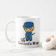 Gardien garçon mignon / concierge dans des salons bleus avec une serpillière. Pour le personnel gardien. Customisez le texte.