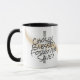 Une croix d'argent se dresse devant un tourbillon de fausse parties scintillant d'or. Au-dessus de la croix se trouve le texte en noir qui dit "Choisi béni pardonné sauvé". L'image avec du texte est répétée de l'autre côté de la tasse.