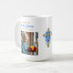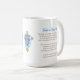 A beautiful coffee mug memorial keepsake for funerals, celebration of life gatherings or to send to friends and family in honor of someone they lost. You can add a photo in the personalized area. The back has a religious poem for comfort to remind you your loved one is in God's arms now. The accent colors used are blue and gold. There is a golden cross with blue flowers on it too.