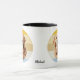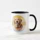 Un portrait d'un beau chien d'or rétriever est la caractéristique de cette tasse. L'image est placée sur un arrière - plan de coucher de soleil rétro, légèrement déprimé, doré, bronzé et bleu rayé, et imprimée deux fois sur la tasse. Votre nom est en script noir entre les images.