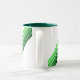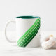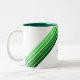 Green lines in varying five shades of blue. Dark to light, bottom to top. Two Sets of stripes are placed diagonally from top to bottom of mug. Personalize with name in centre.