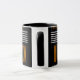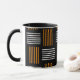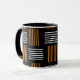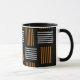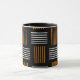 Cette tasse au design moderne du milieu du siècle ressemble à un tissage aux lignes orange et blanche sur un champ de noir.