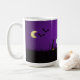 Une tasse à café éffrayante et amusante avec un design d'halloween déplaisant. Dans un cimetière sombre et effrayant. Une pierre tombale dit RIP, avec une bougie et des crânes brillants sur le sol. Une vieille clôture grinçante se penche sur le côté. Un adorable squelette souriant brille et des fantômes à l'air cool tourbillonnent dans l'air. Une chouette est assise dans l'arbre avec des yeux brillants et une lune crescente se trouve sur le côté avec des chauves-souris volant à proximité. Placez-vous sur un arrière - plan de dégradé violet.