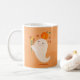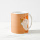 Un mignon petit fantôme sourit joyeusement en flottant à travers un arrière - plan orange sherbet, tenant un bouquet de fleurs d'automne comme un beau jack-o-lanterne équilibre au-dessus de la tête du fantôme. Illustration originale de Noël Snow