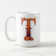 This is a festive, spooky illustration featuring an ornate, glowing orange letter 'T' that looks like an ancient, horned pillar, decorated with autumn leaves and vines. It is centered above two glowing, grinning jack-o'-lanterns nestled in a pile of fallen leaves against a dark, hazy teal background.