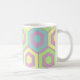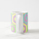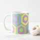 Cette tasse a un design géométrique d'hexagones en bleu pâle, jaune pâle et vert pâle sur un champ de rayures en rose pâle et violet pâle.