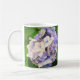 Une photographie d'hydrangeas bleus et violets sur une tasse à café.