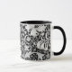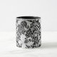 Tasse de café dans une impression florale vintage de William Morris des lis et des iris stylisés, numériquement augmentée et colorée, aux nuances de gris/de gris et le blanc sur un arrière - plan noir