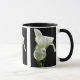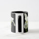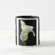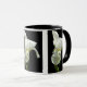 Une tasse audacieuse et vivante avec un design de trois fleurs d'iris blanc contre un arrière - plan noir.