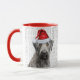The mug has a design of a cute Irish Wolfhound dog wearing a Santa hat. The background of the mug is covered in a repeating pattern of the words "woof". The image is bright and cheerful, and it would be perfect for a Christmas-themed gift.