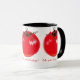 Cette Mug présente un design original avec trois tomates rouge vif d'affilée en haut, et la phrase "I love tomato soup !" sous les photos, en trois langues : français, anglais et espagnol. La tomate sur la photo a l'air "électrifiée", avec la tige verte et les feuilles en lignes de zigzag, et une ligne de zigzag blanc surligné sur la peau brillante rouge tomate. Ces tomates sont rouges chaudes, et cette tasse est idéale pour la soupe de tomate.