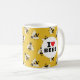 Pour l'apiariste en herbe, fervent jardinier ou entomologiste de voisinage, cette tasse jaune est une passion pour les pollinisateurs avec le texte classique "I Heart Bees" sur un cercle blanc sur un motif d'abeilles illustrées et à l'apparence amicale.