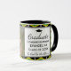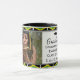 Élégant Mug moderne de Graduation avec texte et photo personnalisables. Un Arrière - plan montre le DRAPEAU DE JAMAÏQUE dans un motif carrelé. Le design affiche l'image de l'espace réservé à gauche et ajoute votre message personnel à droite, ainsi que le texte personnalisable qui se lit à DIEU SOYEZ LA GLOIRE. Bordure noire avec petit motif de finition graduation. Un cadeau idéal pour les diplômés.