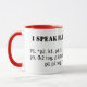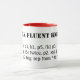 Cette tasse humoristique a les mots "je parle couramment tricot" et est décorée avec des instructions motifs tricots.