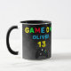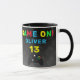 Jeu Sur Contrôleur Vidéo Jeu Anniversaire Mug. Contrôleur de jeu, nom personnalisé et âge sur un motif sombre.