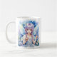 Une jolie fée aux cheveux tressés de lavande et ailes irisées tient une baguette papillon entourée de fleurs et de bulles.
