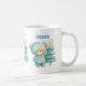 Une tasse avec une adorable illustration. Un ours douillet aux étoiles et aux étincelles dans sa fourrure. À côté d'un sapin de Noël. Couleur pastel bleu-vert. Whimsical et mignon.