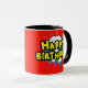 Une tasse à café qui est amusante et tendance, ce design comprend le mot "Joyeux anniversaire" à l'intérieur d'une bulle de discours avec un arrière - plan rouge. L'intérieur et la poignée sont noirs. Commandez les vôtres dès aujourd'hui ! Clipart : AnneIllustration https://www.etsy.com/shop/AnneIllustration