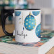Customisez cette tasse de boisson chaude avec Bondi Blue et Gold Polka OEufs de pâques piqués suspendus à la cordes d'or. Design élégant, moderne et contemporain. Ajoutez votre nom et le nom de votre boisson chaude préférée. Vous pouvez même changer le texte en Joyeux Anniversaire, Joyeux Pâques et bien plus encore. Bon appétit !