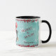 Sur cette tasse, un adorable pingouin est habillé de son casquette d'hiver rouge et de son écharpe contre un subtil arrière - plan de flocon de neige bleu et blanc. En haut et en bas, il y a des bordures de confettis rouges. Le texte rouge de chaque côté indique "MERRY & BRIGHT", et le nom de votre enfant est en gris en bas sur un côté. Idéal pour les enfants de tous âges !