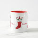 Cette tasse de café ou de thé est entourée de bas de Noël rouges et blancs qui ont de mignons gnomes barbus qui regardent du haut entre deux sucres de canne et des feuilles verts saints avec des baies rouges. Customisez le texte rouge Joyeux Noël avec les modèles.