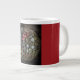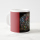 Une collection de casquettes de bouteilles rustiques dans un bocal en verre recouvre l'avant de cette tasse.