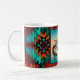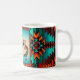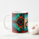 C'est un "One of a Kind" unique Mug de café Kokopelli Sud-Ouest! Il comprend deux Kokopelli du sud-ouest jouant de la Flûte et dansant sous le soleil sur un Arrière - plan turquoise et orange du coucher de soleil...Entouré d'une frontière sud-ouest en Turquoise, Orange & Black! Design D'Art Original Par L'Artiste Kerry Miller.