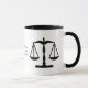 Les échelles de la justice sur un café, de la tasse de thé dans le noir pour une mandataire, du juge, du paralégal, du sténographe de cour, de n'importe qui aux services judiciaires ou d'une personne qui travaille vers la justice ou pour donner comme cadeau aux clients avec votre information de contact dessus