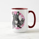 Pour la personne qui aime les Français dans un monde qui aime les Français. Ce dessin ultra-sucré présente une cascade de coeurs de Saint-Valentin tourbillonnant derrière une illustration dessinée à la main d'un Bulldog français à la broche noire tenant sa poupée française : Frenchie aime carré! Paire avec une grande tasse de tasse rouge de support et de poignée (mais n'hésitez pas à choisir la combinaison de couleurs qui vous convient le mieux). OEuvre originale et design exclusif de l'artiste du Nord-Ouest du Pacifique (et propriétaire français) Diana Crites of Woebegone Art.