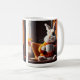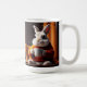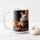 Cette tasse à café dispose d'un lapin lapin douillet qui a son café du matin.