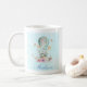 Une tasse à café personnalisée avec l'illustration charmante d'un petit lapin qui roule le long d'une montgolfière ornée d'un joli ruban rose, agrémentée de fleurs et de papillons.