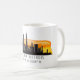 Tasse à café caractéristiques Chicago Illinois silhouette de la ligne d'horizon de la ville avec éclaboussure d'aquarelle au coucher du soleil et coordonnées de latitude et longitude