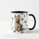 Un adorable Terrier Dog australien est assis sur les deux côtés de cette tasse. Le texte entre les deux images dit "Le 8ème jour, Dieu a créé le TERRIER AUSTRALIEN et l'a appelé TRÈS BIEN". Les images de chien et la bannière blanche ovale contenant les champs de texte sont placées sur un arrière - plan blanc avec des empreintes de pattes noirs.