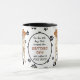 Un beau chien breton est assis sur les deux côtés de cette tasse. Le texte entre les deux images dit "Le 8ème jour, Dieu a créé le CHIEN BRITANNIQUE et l'a appelé TRÈS BIEN". Les images de chien et la bannière blanche ovale contenant les champs de texte sont placées sur un arrière - plan blanc avec des empreintes de pattes noirs.