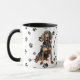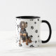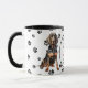 Un beau Chien noir et Tan Coonhound est assis sur les deux côtés de cette tasse. Le texte entre les deux images dit "Le 8ème jour, Dieu a créé le COONHOUND et l'a appelé TRÈS BIEN". Les images de chien et la bannière blanche ovale contenant les champs de texte sont placées sur un arrière - plan blanc avec des empreintes de pattes noirs.