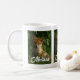 Une tasse avec une photo montrant un mignon petit renard à fourrure rouge et blanche. Entouré de feuilles et d'herbes verdoyants.