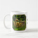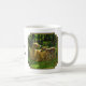 Two whitetail deer in the forest during spring time. A whitetail doe lis dans la green grass next to a creek and licks her newborn fawn as sunlight streams through the trees to warm them. Réaliste artwork created from an original oil painting by wildlife and equine artist Crista S. Forest.