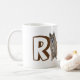 Capital letter on one side with brown dog to right. Reverse side shows name with same dog sitting behind the letters of the name. Text is dark brown and may be personalized with your letter and name.