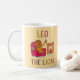 Leo le Lion, assis à côté d'un feu, mangeant un gâteau et buvant une tasse de thé. Roi du salon. Ceux nés entre le 22 juillet et le 22 août tombent sous ce signe étoilé