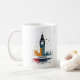 Un design abstrait, inspiré de l'art moderne, met en valeur la silhouette de Big Ben, soulignée de formes géométriques et de touches de couleurs vives parsemées sur la tour. Le ciel dégradé est remplacé par des aplats de couleurs dans un style pop art, conférant au design une allure dynamique. Des représentations abstraites de la Tamise sont suggérées par des lignes ondulées et des formes irrégulières à gauche, tandis que les pavés à la base sont minimalistes et anguleux. Le mot « LONDON » s'affiche en bas au centre, dans une police nette et sans empattement, à l'aspect superposé, sur un mug, tasse et plus encore.