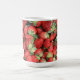 Une tasse avec une photo colorée représentant une bande de lustres fraises rouges.