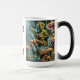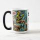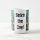 Une tasse qui se transforme et dévoile une fille cyberpunk sur un champignon qui se réchauffe, avec "Saisir la journée" en caractères gras et électriques. C'est une dose quotidienne de motivation futuriste !